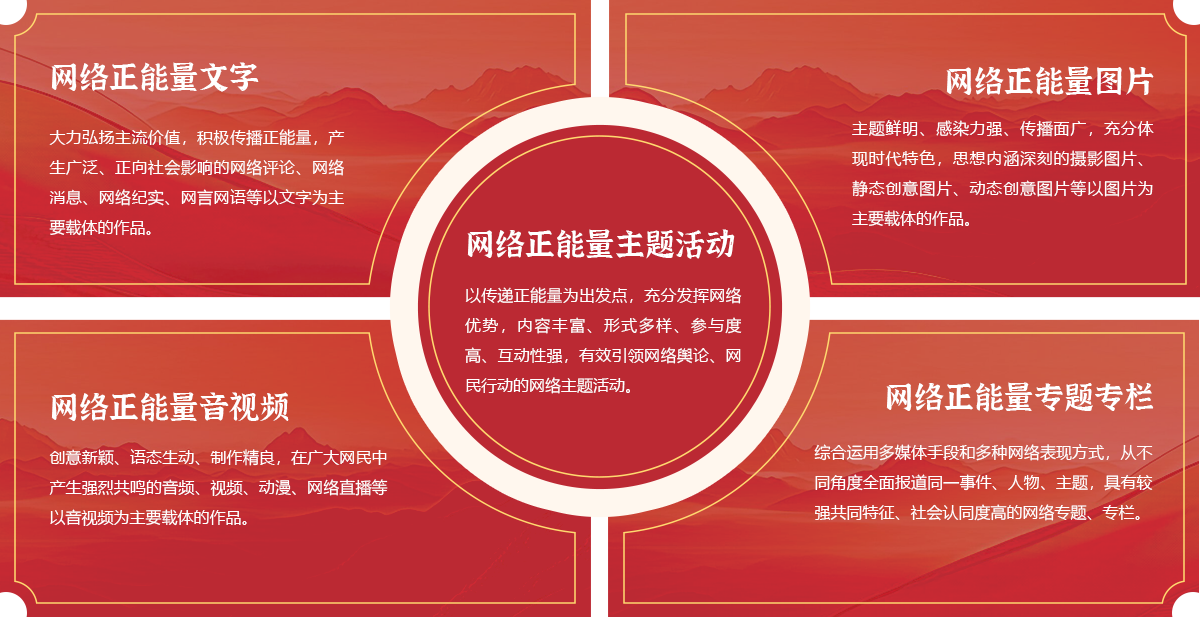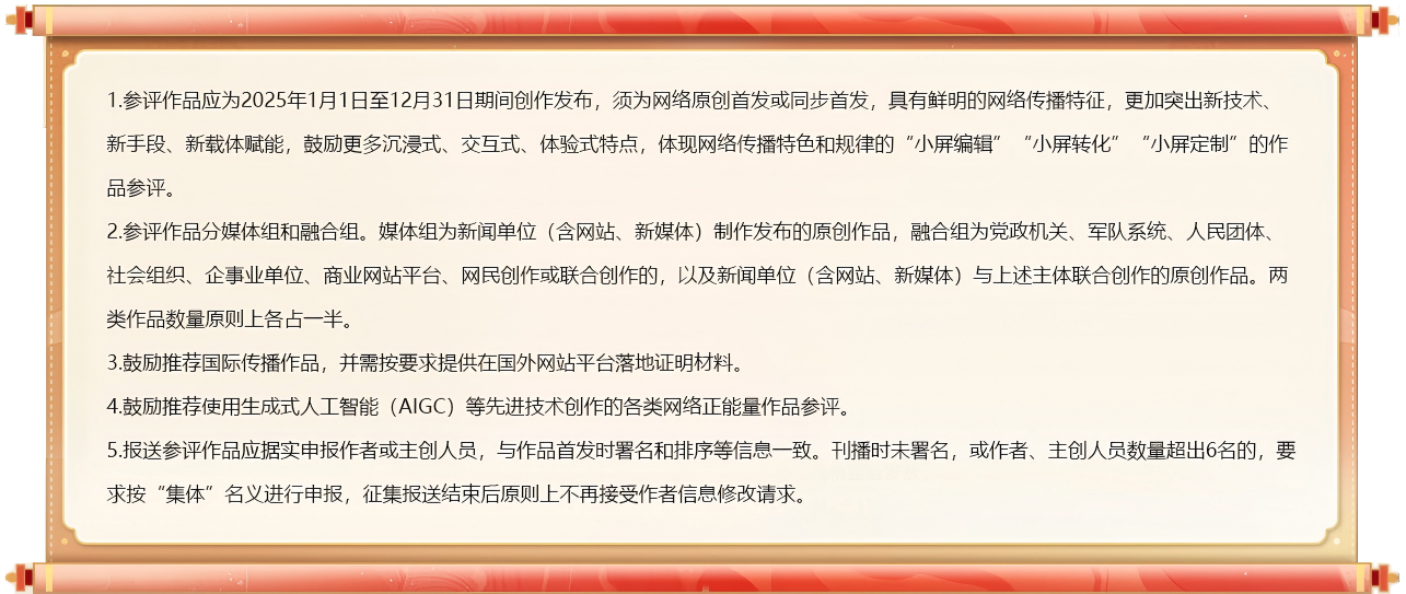 2025年1月1日至 2025年12月31日期间,党政机关、 群众团体、社会组织、企事业单位、军队系统、新闻单位(含网站、新媒体)、商业网站平台、网民等原创发布的网络正能量内容,包括文字、图片、音视频、专题专栏、主题活动。